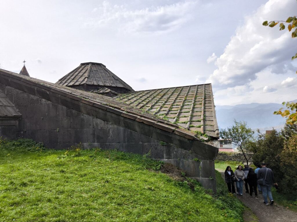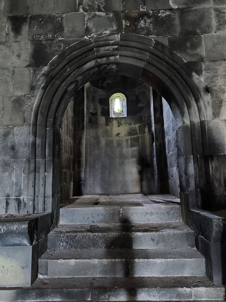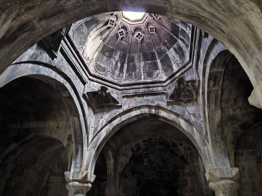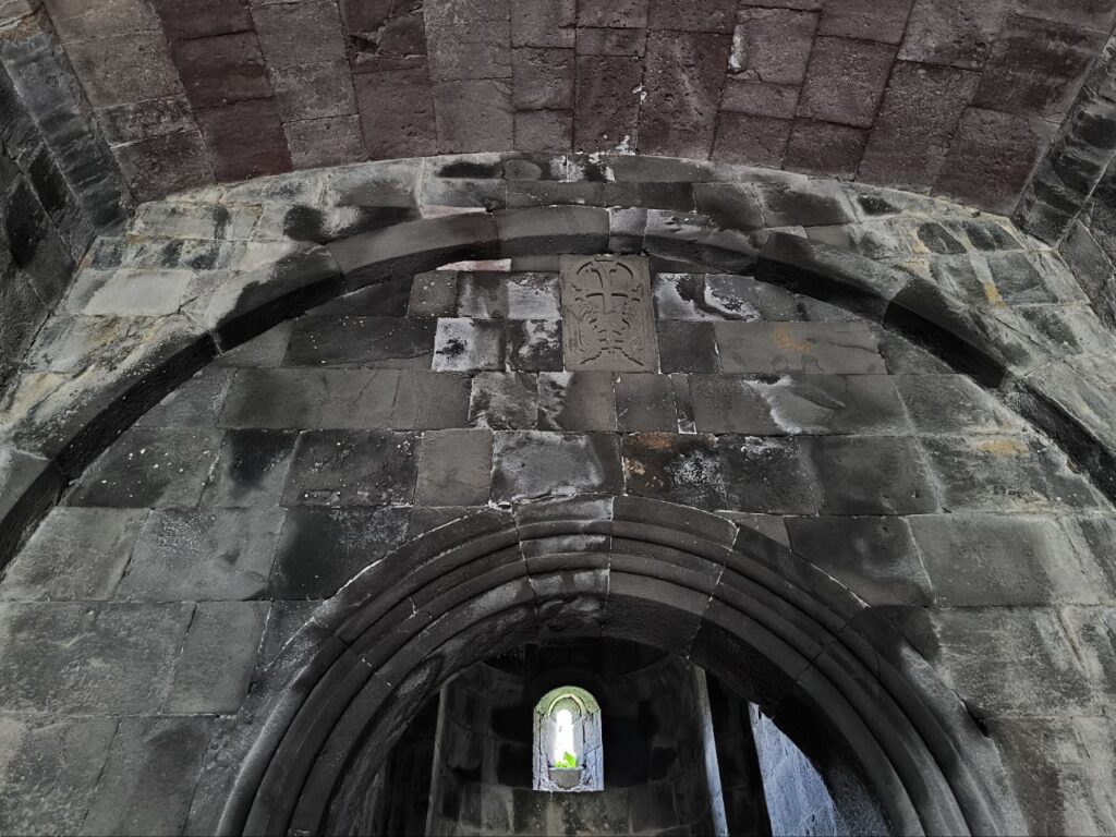 Կենտրոնական չորս սյուները և պատերից առաջացած երկու որմնասյուները միասին բաժանում են սրահը ինը հատվածի։ Միջին մասը, որը գտնվում է չորս սյուների միջև, իր վրա կրում է երթիկավոր բացվածքով գմբեթավոր գավիթ։ Շրջապատող ութ հատվածները ձևավորում են կամարակապ քառանկյուններ՝ ստեղծելով ներդաշնակ տարածական կառուցվածք։
